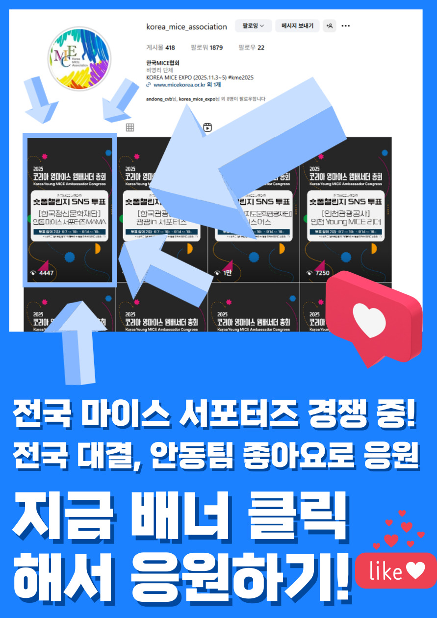 전국 컨벤션뷰로와 경쟁 중! 서울·부산·대전·수원 등 전국 vs 안동. 안동 청년들이 직접 만든 영마이스 앰버서더 숏폼, 좋아요 한 번이 순위를 바꿉니다.