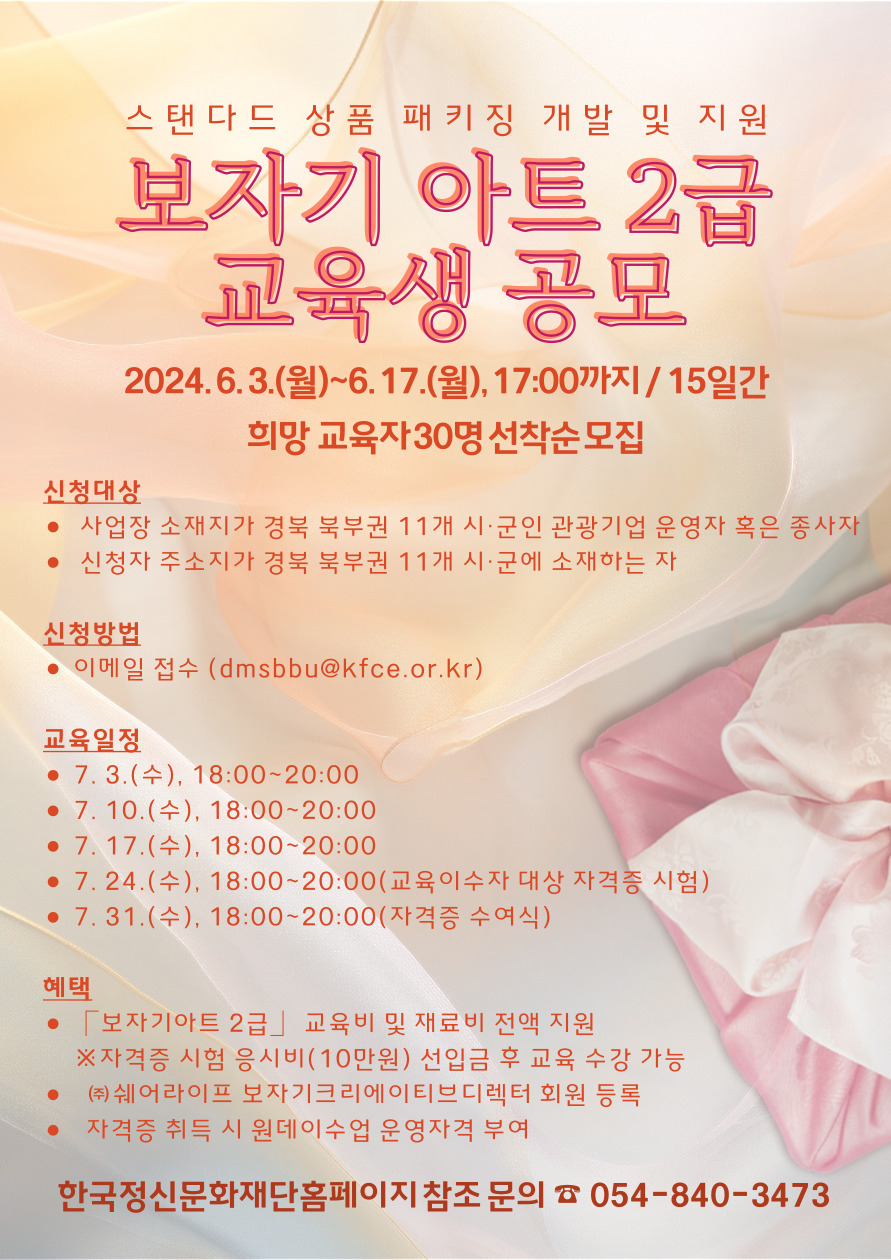 경북 북부권 관광산업 종사자를 대상으로 스탠다드 상품 패키징 개발 및 지원⎾보자기아트 2급⏌ 교육 진행을 통해 관광상품 디자인 차별화 및 브랜드 경쟁력을 강화하고, 이에 따른 자격증 취득을 통해 지역 경제를 활성화하고자 패키징 디자인 교육생을 아래와 같이 공모합니다.